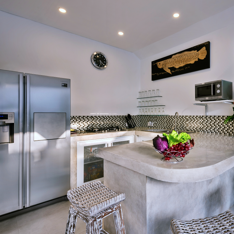 The open-space kitchen adjoins the living area, dining area, and pool. It comes fully equipped with a large fridge, water dispenser, gas stove, sink, trash bin and microwave. The kitchen also includes all necessary cookware, such as pots, pans, a toaster, kettle, blender, rice cooker, utensils, kitchen knives, plates, and glasses.